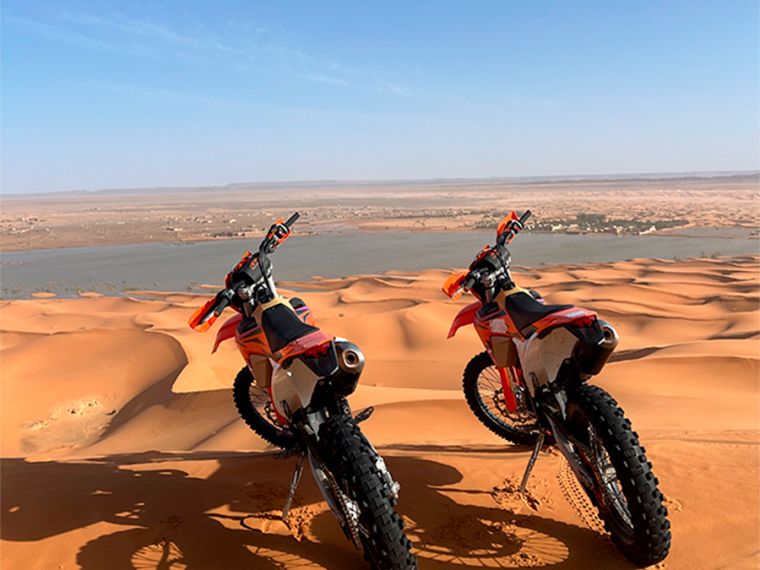 En Moto Enduro Merzouga entendemos que la clave para una aventura inolvidable en el desierto es contar con una motocicleta confiable, potente y adaptada al terreno extremo del Sahara.Es por eso que nuestros tours están equipados con las legendarias KTM 450 EXC Año 2024, una de las mejores motocicletas de enduro del mercado.