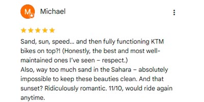 Descubre la inmensidad del desierto de Marruecos en un recorrido de 3 días a bordo de una KTM de última generación. Atrévete a cruzar las impresionantes dunas de Erg Chebbi, visitar pueblos bereberes y explorar rutas off-road exclusivas que harán de esta experiencia una travesía inolvidable.