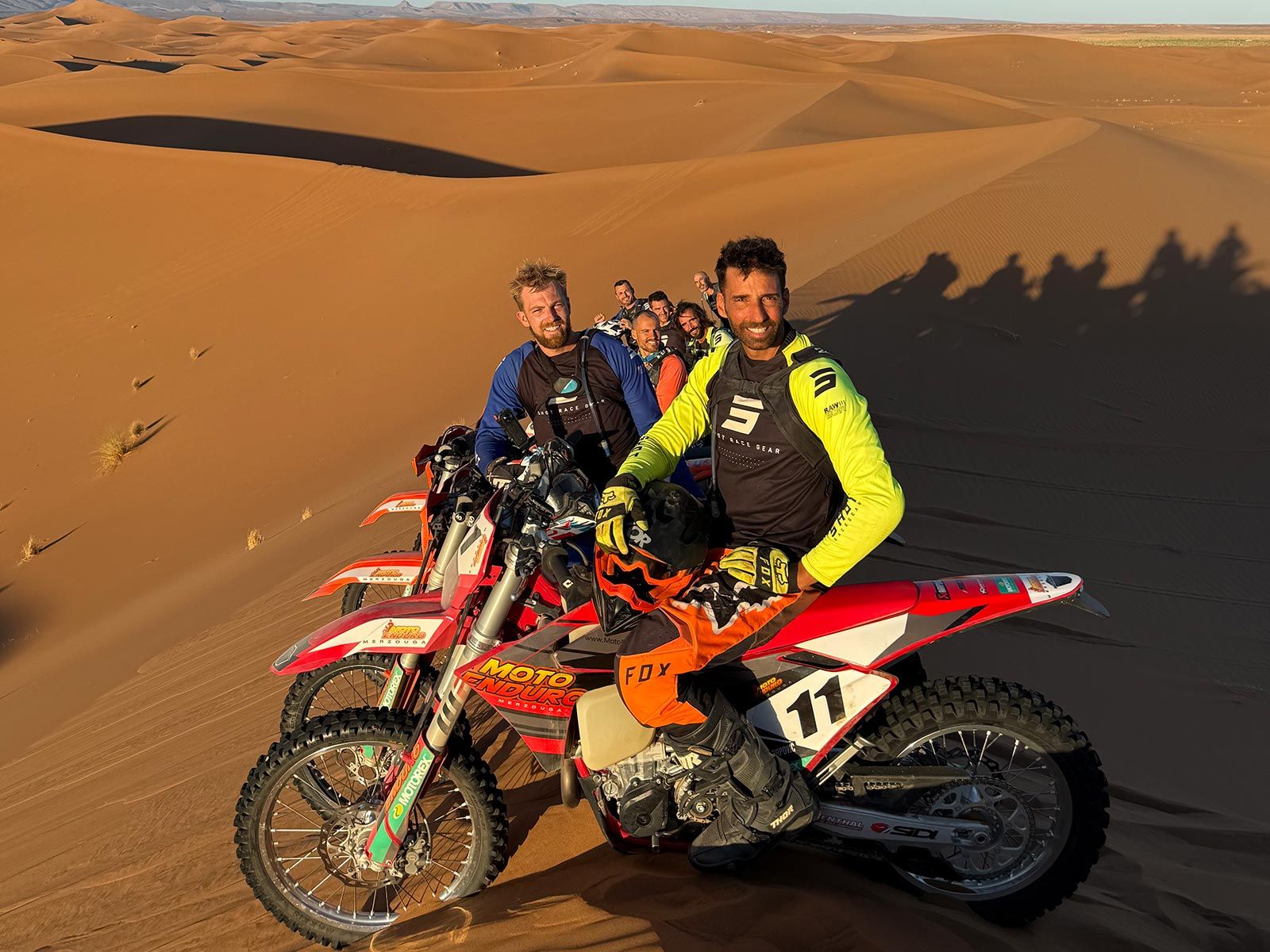 9:00: Una vez ya equipados y con la moto, os daremos una pequeña explicación donde aprenderemos los principales trucos y precauciones para poder disfrutar de la moto con seguridad. Comenzaremos la parte práctica conduciendo las motos por una zona lisa, realizando distintos ejercicios y juegos que nos ayudaran a ganar equilibrio y confianza en las motos. Gradualmente iremos aumentando el nivel de dificultad, con el objetivo de que todas podamos surfear por las dunas del desierto del Erg-Chebi.